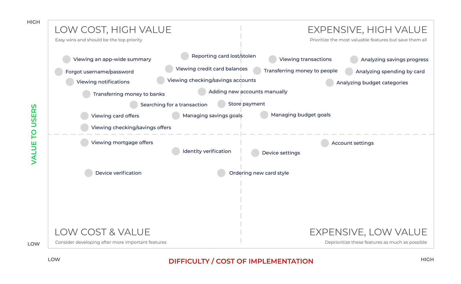 This discovery engagement primarily resulted in a set of strategic recommendations for what the Chase mobile experience should aim to prioritize as their core experience: Spending & Savings Analysis, Money Transfers, Account Details, and Store Payment.