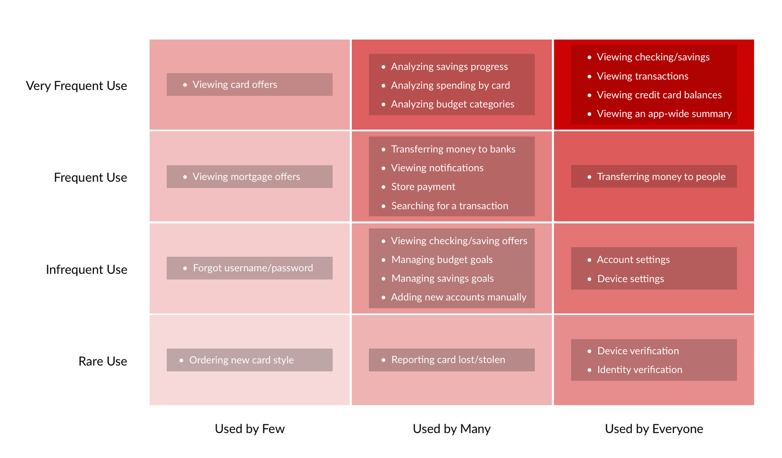 Beyond the qualitative research we performed to create personas and journeymaps, we supplemented these insights by analyzing usage data for the current state Chase mobile apps which listed the most/least used features within their current state experience.