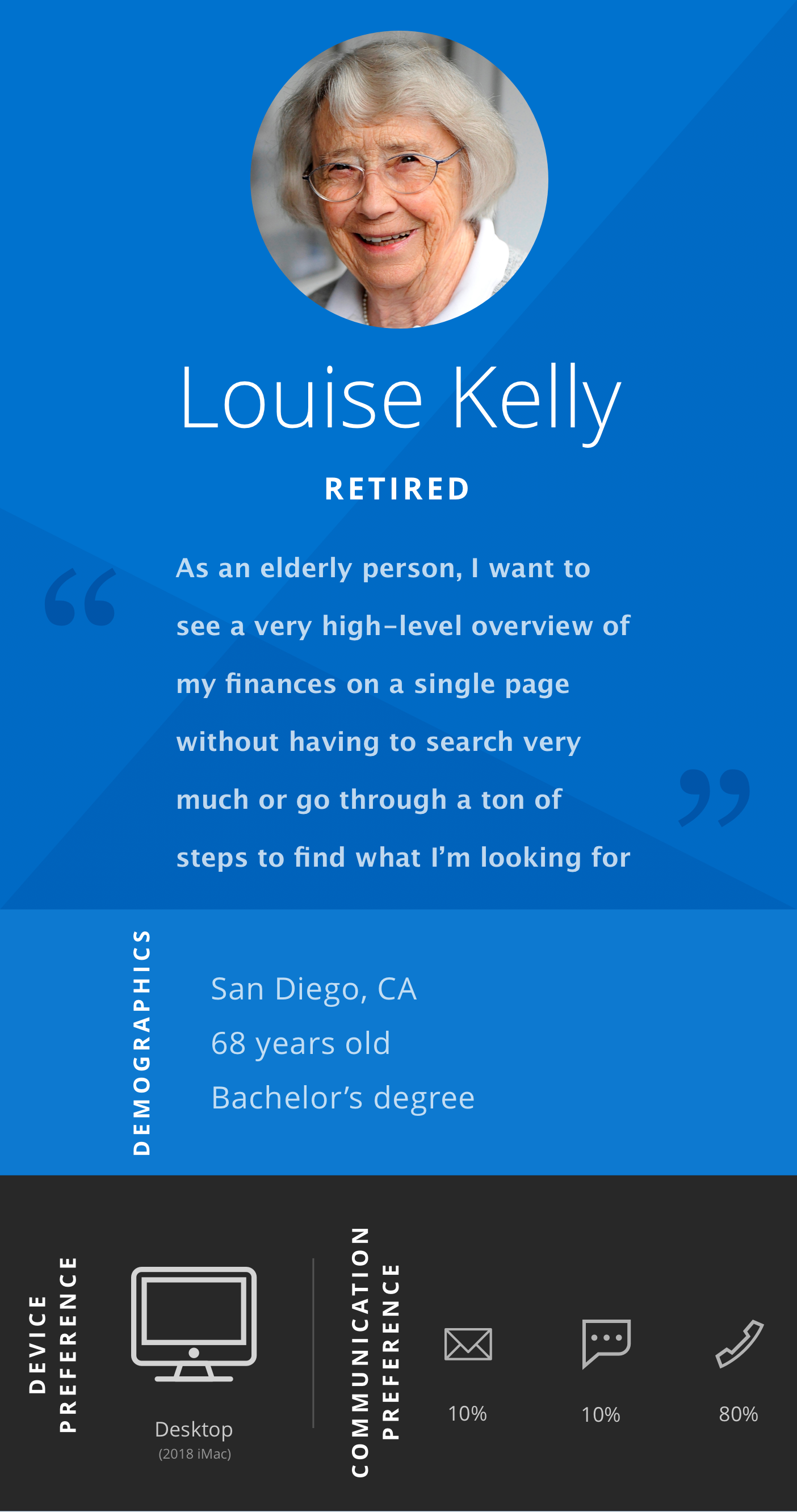 We developed 4 personas to design for: millennials, young adults, people mid-late career, and folks of retirement age.