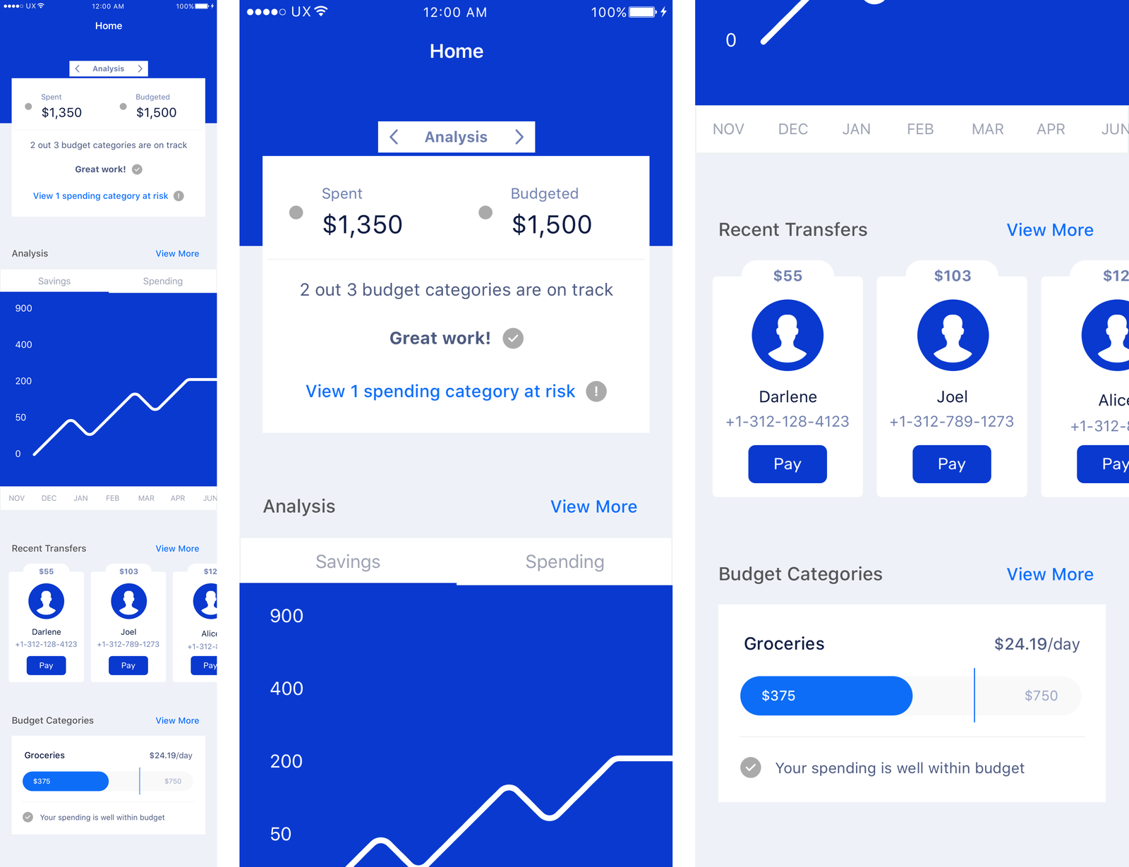 Here’s an example of some sketching I did to quickly begin visualizing how initial ideas might fit into the app. This included first-pass thoughts on how to visualize things like alerts, spending/savings analysis, transferring money to friends and/or other accounts, etc.