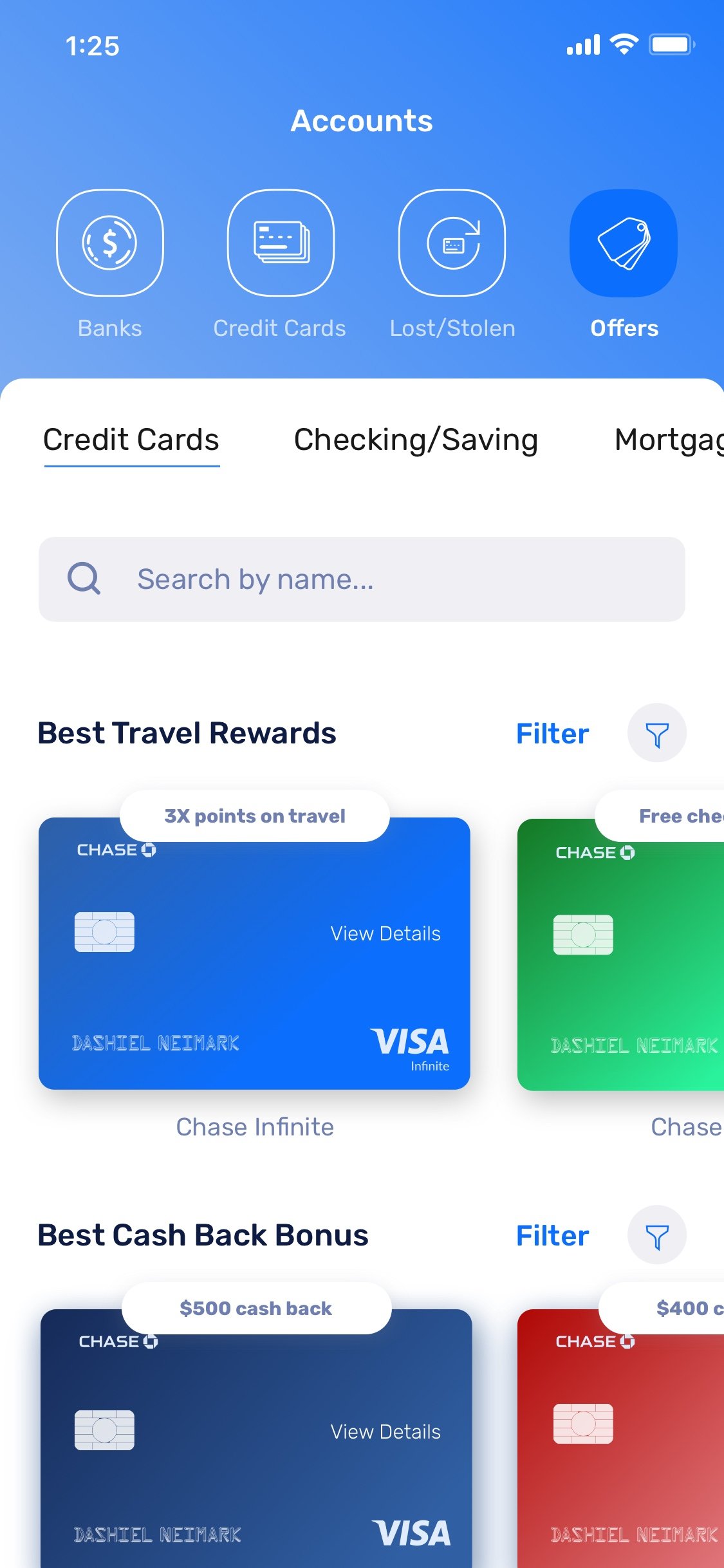 View and accept offers for new credit cards, checking/savings accounts, and mortgages