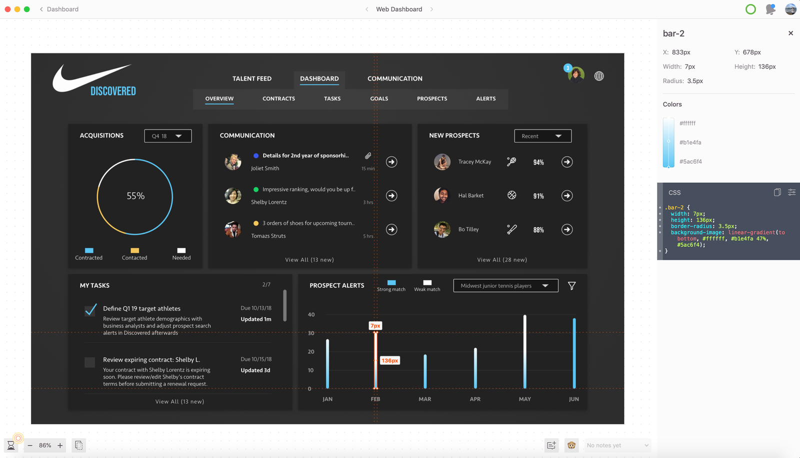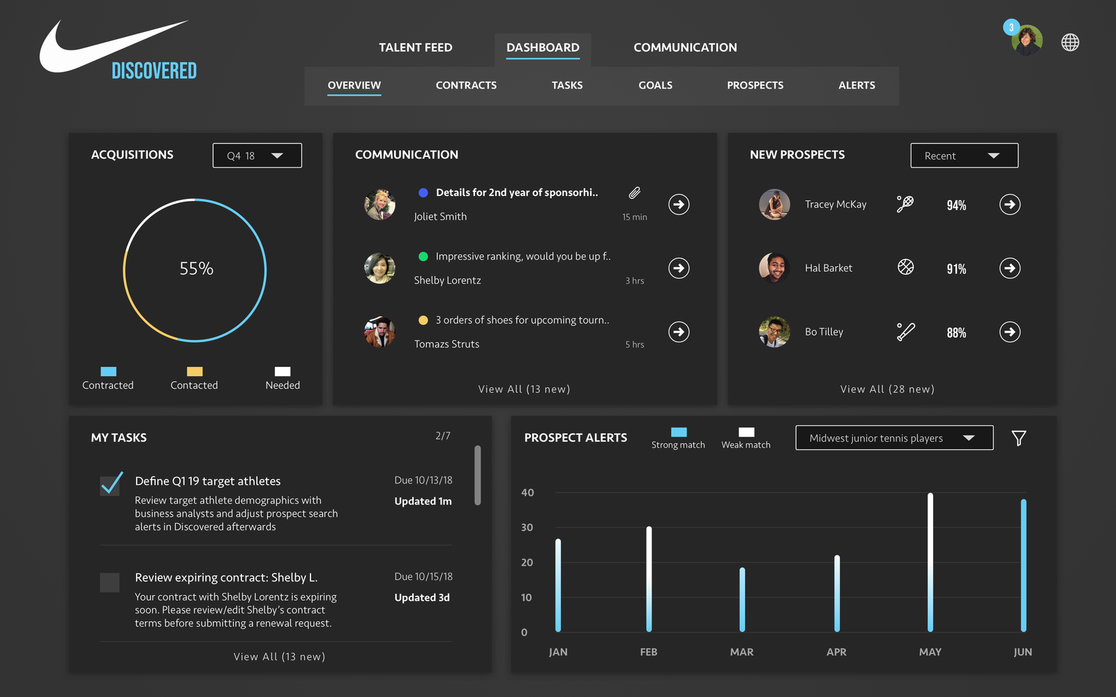 User validation is a powerful thing. After showing the recorded user feedback sessions for each of the prototypes (some very specific to new athlete alerts or contract management, some more broad) to the stakeholders involved, the dispute was settled and we moved forward with confidence and alignment. At the end of the road, user feedback made it quite clear that users were consistently asking for a summary view of 5 different aspects to the experience: acquisitions, communication, new prospects, tasks, and prospect alerts.