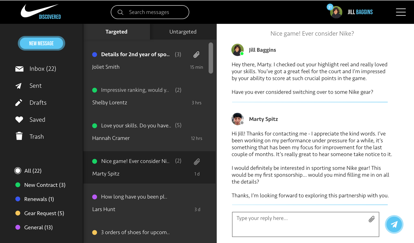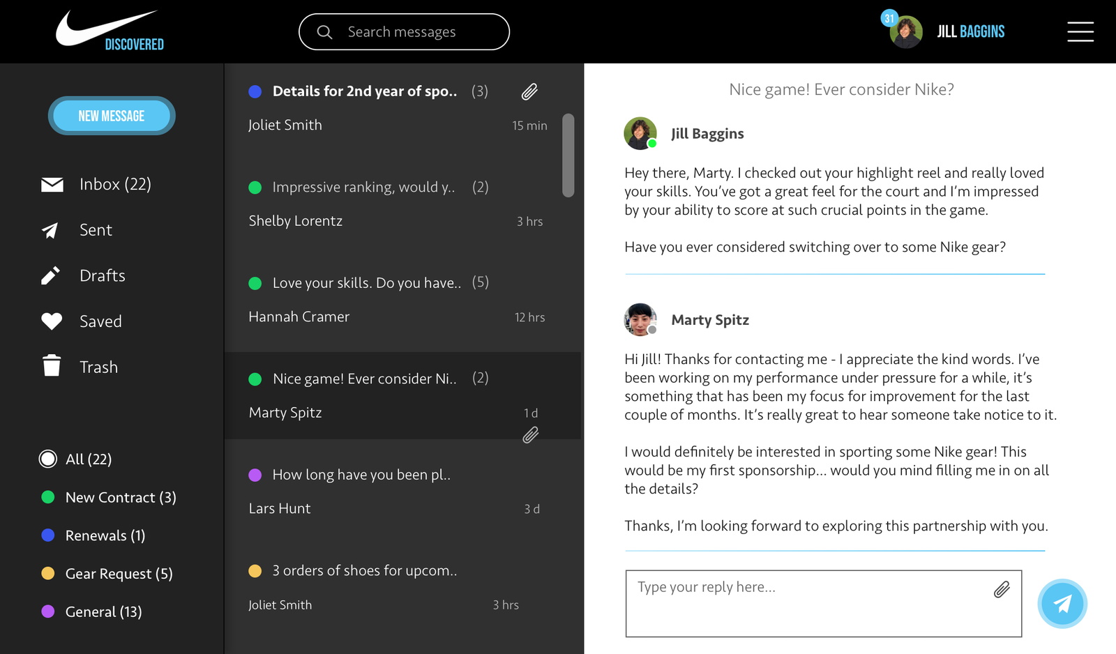 I like the direction but would like additional tooling/functionality for organizing the type of message an athlete sent me based on what the reason for the message was (contract renewal, gear request, etc.)