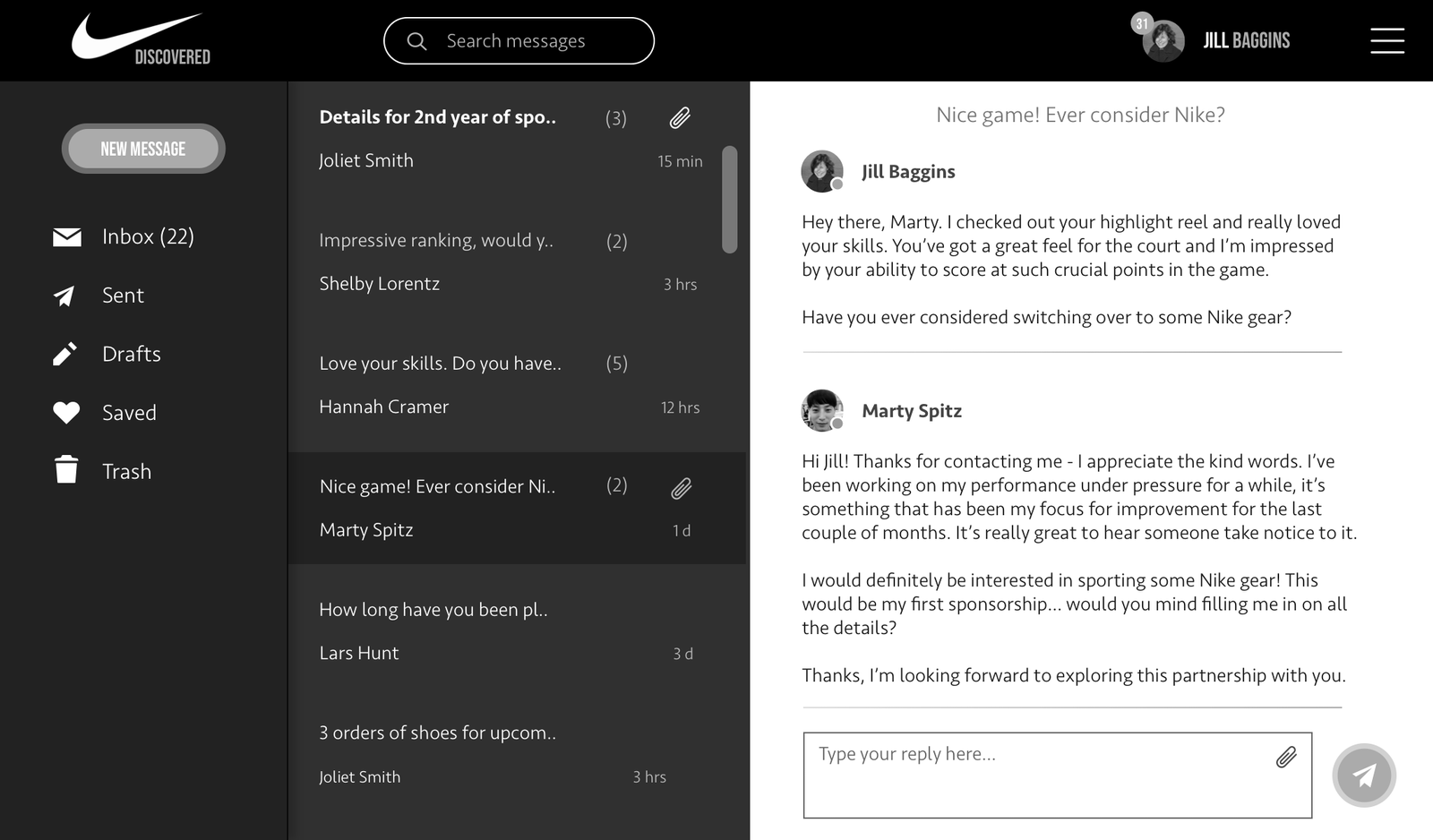 From the Brand Manager side (our first focus), the app we created, Nike Discovered, enabled Nike Brand Managers to search for, save, communicate with, contract and manage athletes.