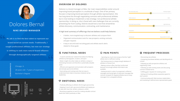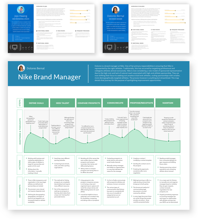 For example, I observed brand managers using a wide array of various tools and processes to accomplish their goals. To define and track athlete acquisition goals for the quarter they used things like Excel and Word that lacked transparency and shareability. Searching for and filtering through athletes required visiting countless websites, most with different methods of interaction. Communicating with and managing contracts for athletes was very unorganized and relied on manual organization within Outlook and painful file storage and retrieval within Dropbox.