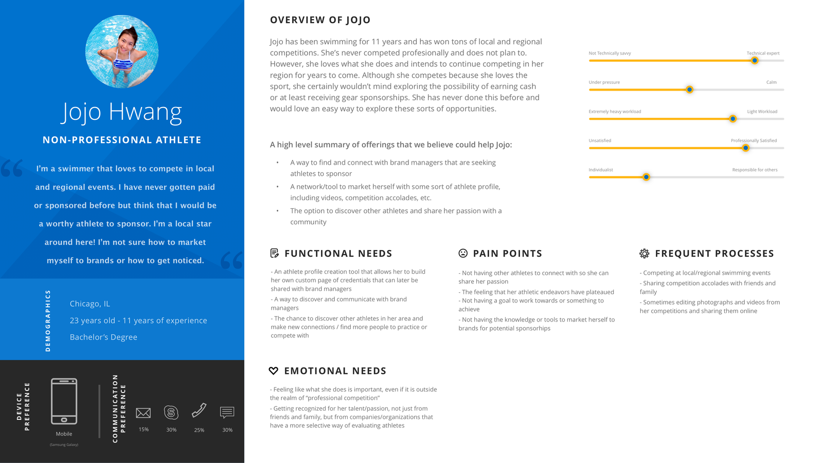 With brand managers, I tried to find out why they take certain steps, like how they define sponsorship goals, who they interact with throughout that process, and the tools that they currently use to seek out, communicate with, and contract athletes. What were their motivations and end goals?